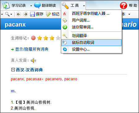 4、当您开启《西班牙语助手》取词模块后,将鼠标移至屏幕上任何出现中、西班牙文的地方,西班牙语助手将会弹出解释窗口: