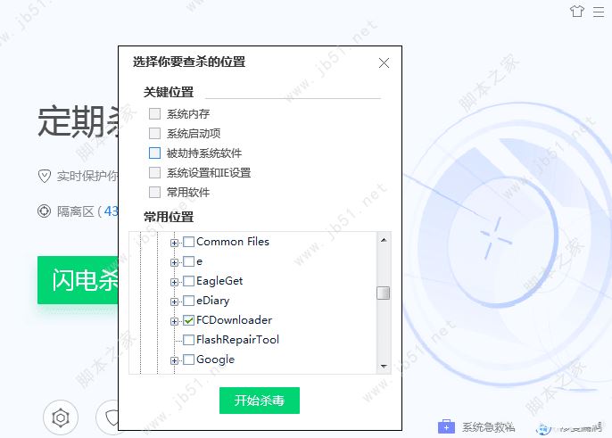 此外查毒这方面也不是很懂,好像各安全管家或卫士都有指定位置杀毒的功能,软件安装后找到安装路径可以利用此功能试试,安装目录名称叫做FCDownloader。