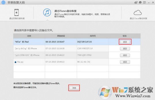 第二步:选择想要恢复的备份数据,点击【选中】。若未出现设备信息,可点击正下方的【预览】手动式选择 iTunes 备份数据。