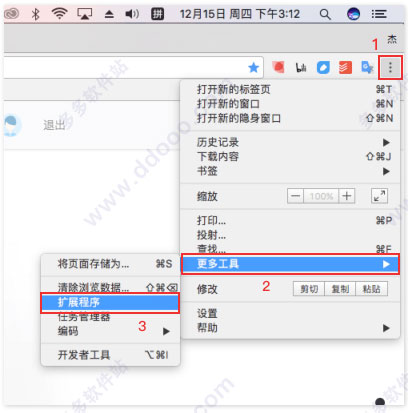 1.下载完成后,按下图所示在浏览器右上角 打开“扩展程序”页面。