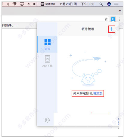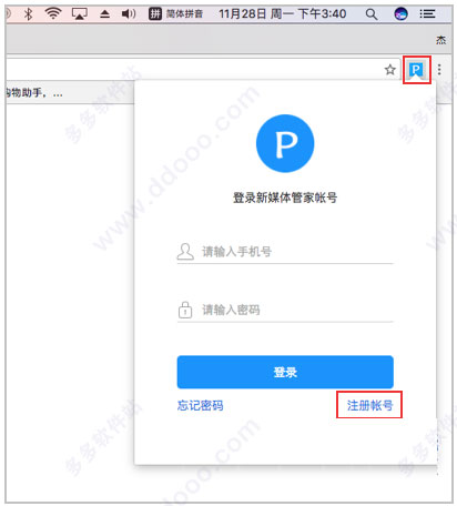 点击插件图标,输入新媒体管家帐号;如果没有帐号,请先注册。