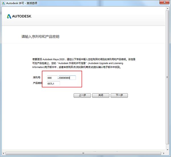 8、输入maya2020.4产品序列号【666-69696969、667-98989898、 400-45454545、066-66666666】任意一组,产品密钥【657L1】;