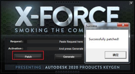 11、以管理员身份运行注册机文件“xf-adesk20_v2.exe”,点patch按纽弹出“successfully patched”;