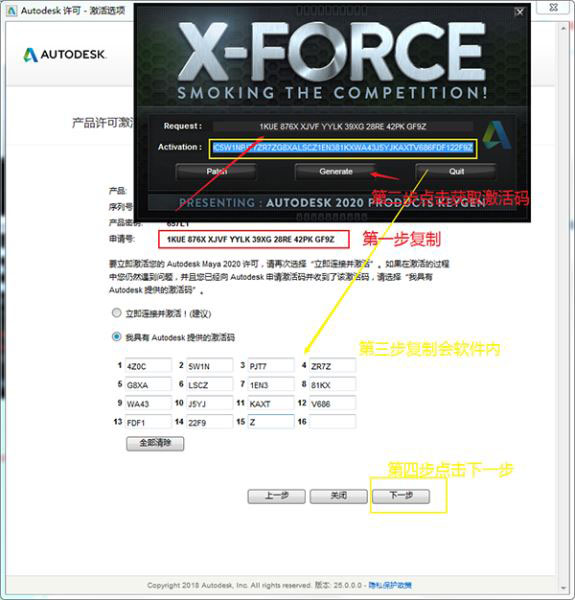 12、再将申请号【1KUE 876X XJVF YYLK 39XG 28RE 42PK GF9Z】复制到注册机request中,再点击generate得到激活码【4Z0C5W1NPJT7ZR7ZG8XALSCZ1EN381KXWA43J5YJKAXTV686FDF122F9Z】,最后将激活码复制到软件注册框中,最后点下一步;