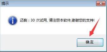2、这时候出现提示:还剩 30 次试用,请注册本软件,谢谢您的支持! 点击确定。