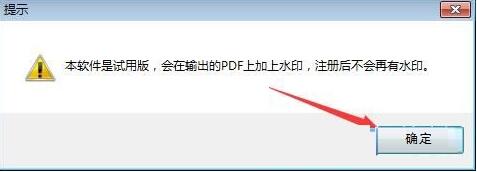 4、出现提示:本软件是试用版,会在输出的PDF上加上水印,注册后不会再有水印,点击确定。