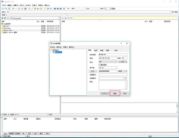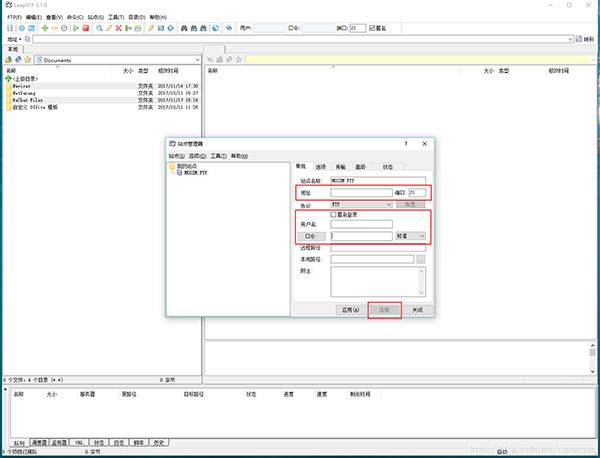 4、输入站点名称=>输入地址、用户名、口令=>点击连接