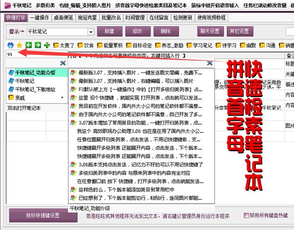 千秋笔记是一款非常实用的多功能电脑笔记记录软件,支持笔记快速检索、快捷打字、一键操作、时间管理、桌面便签、批量改名等功能,能够帮助用户更好的将零碎笔记进行归类整理,软件还加入了最新的数据库储蓄技术能够快速的帮助用户完成对笔记的检索,支持拼音首字母快速搜索还能对笔记中的中文进行一键翻译,用户学习,会议记笔记更加的简单方便!