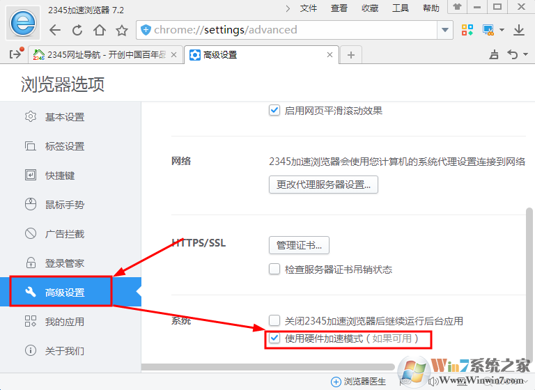 2、浏览器选项选择高级设置-系统-“使用硬件加速模式”取消勾选