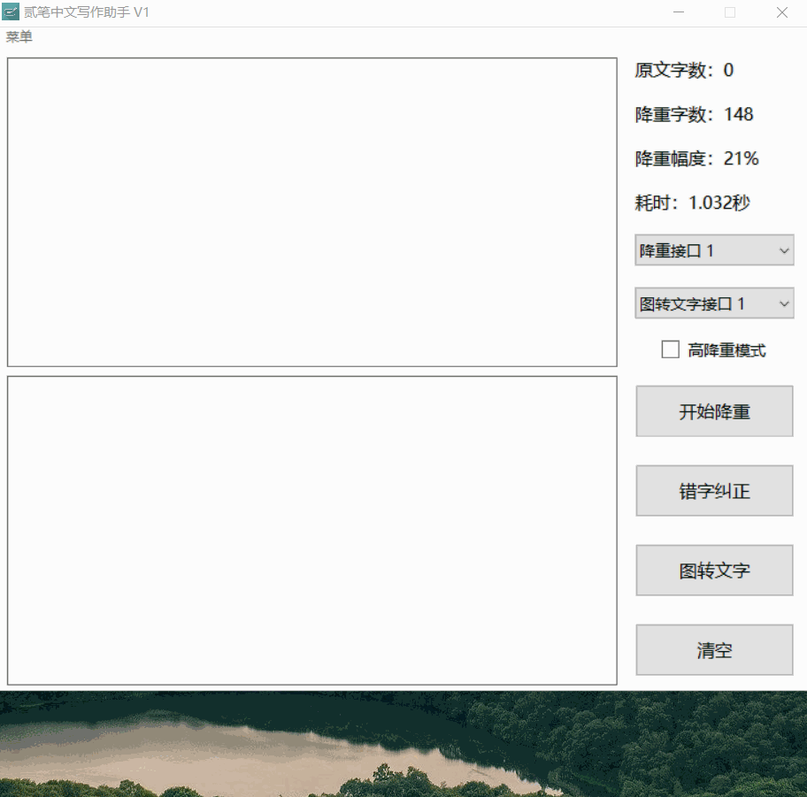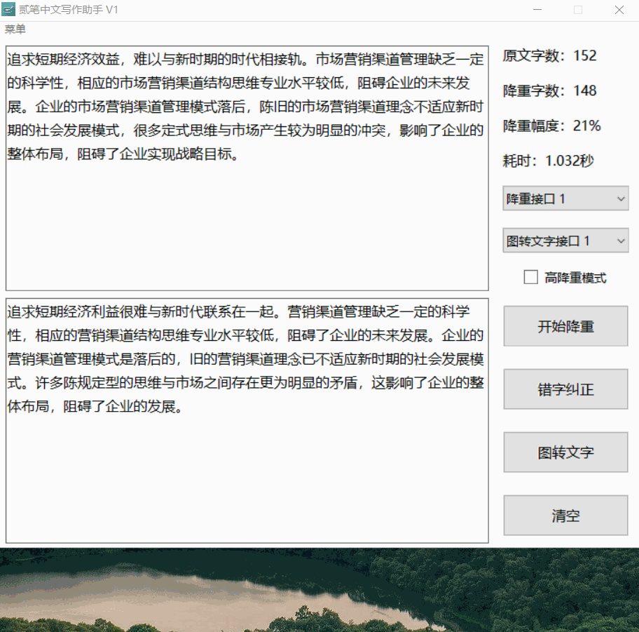 贰笔中文写作助手是一款完全简单易用的中文写作助手,拥有降重、错字纠正、语音朗读、智能联想、智能造句、片段查重等功能。具有免安装、小巧轻便、功能强大等特点;并且接口都支持高降重模式,为用户提供简单粗暴的文章降重功能,其中文字转换接口采用自谷歌公司、微软公司、百度公司、搜狗公司、金山公司、腾讯公司、网易公司;搜索技术分别采用自百度搜索、神马搜索、搜狗搜索、360搜索,语音技术采用自百度公司;用于文章降重的好帮手,欢迎需要进行文章编辑降低重复度的朋友前来获取!