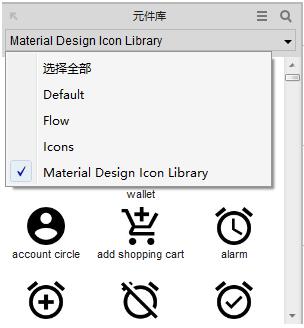 3. 然后再在元件库下拉菜单中选择Material Design Icon Library就可以看到载入的图标元件了,然后就是将需要的图标拖入的编辑界面中使用了。