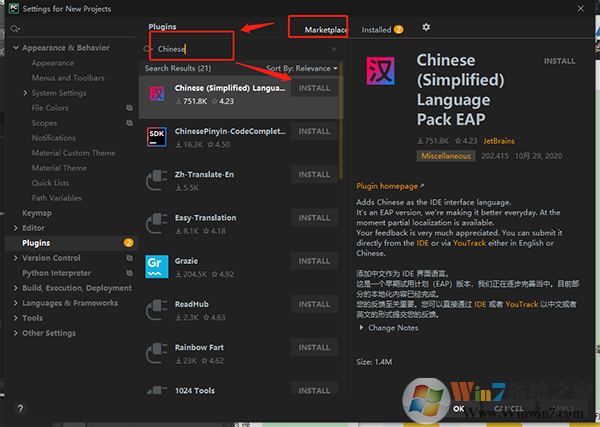 11、选择“marketplace”接着在输入框中输入“Chinese”后即可找到汉化插件,点击“install”进行下载;