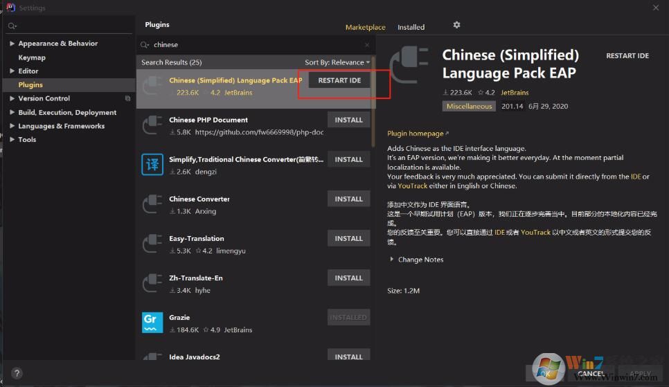 Ctrl+ALT+S 打开 Settings -> Plugins ,搜索Chinese安装,然后重启即可