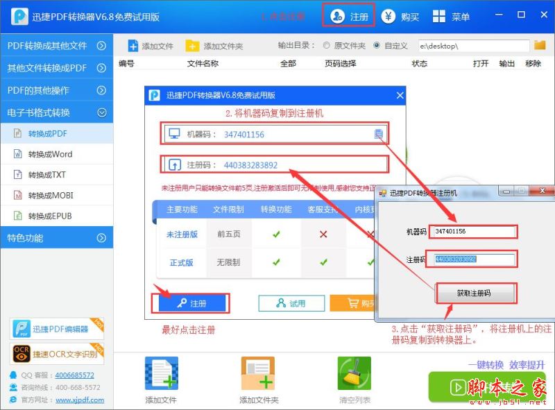 1、下载并解压数据包,然后运行PDFConvert.exe程序打开迅捷pdf转换器软件,我们可以看到软件是免费试用版,点击“注册”弹出注册界面,然后回到软件文件夹,运行打开迅捷PDF转换器注册机,将注册界面机器码数字复制到注册机“机器码”方框内,最后点击“获取注册码”得到激活注册码,将得到的注册码复制到软件注册界面“注册码”这一方框内,点击“注册”按钮即可注册激活