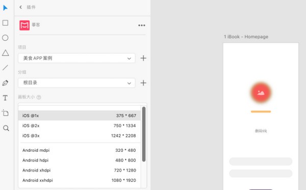 点击倍率下拉框,根据设计稿的画板大小,选择设计稿对应的倍率。例:750px*1334px的设计稿对应 @2× 。