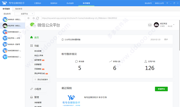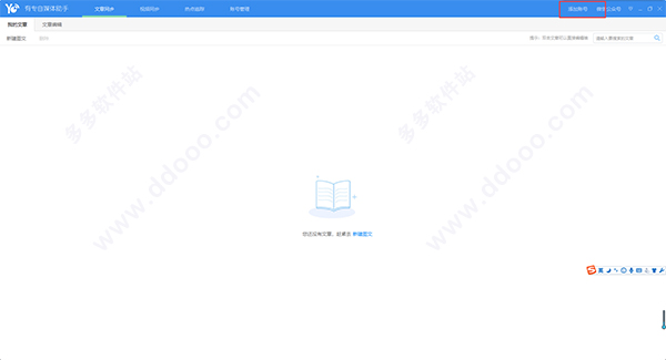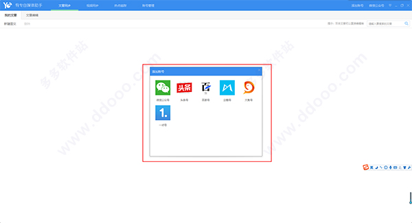 当您开始使用有专自媒体助手(以下简称助手)时,您首先需要添加自媒体账号,助手目前支持微信公众号,头条号,百家号,企鹅号,大鱼号和一点号六个自媒体平台,您可以点击助手右上角的“添加账号”按钮