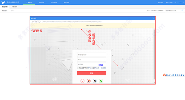 您需要正确输入登录信息并完成登录, 之后登录弹框会自动关闭并完成账号添加。(注:只有申请成为自媒体并通过平台审核的账号才可以成功添加,普通账号无法成功添加),若您选择了错误的平台或无法完成登录,您需要手动点击弹框右上角来关闭弹框。