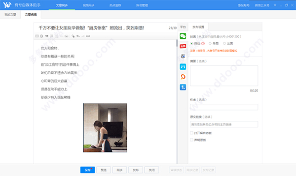 其中左侧为文章标题和内容的编辑区域。右侧为文章设置区域,可以在这里设置文章封面,以及各个自媒体平台对应的设置信息。下方为操作按钮,可以进行文章保存,同步,发布,预览,关闭等操作。