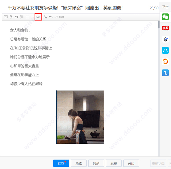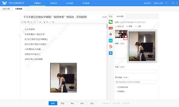 在编辑页面中,您可以通过右侧上方来设置文章的封面,请注意,封面只能使用文章中包含的图片,并且图片不能小于400*300像素,您可以选择自动封面模式,但是由于平台的限制,微信公众号和大鱼号不支持自动封面模式。