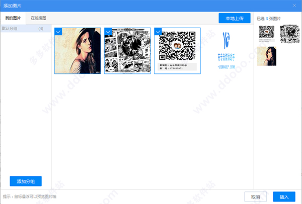 支持选择本地图片和在线搜图,支持搜索gif图片,本地图片支持分组管理。