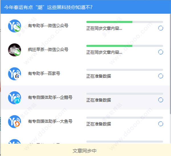 账号选择完成后,点击右下角的同步或发布按钮,则会弹出同步(发布)进度弹框,弹框会显示文章同步或发布的进度和结果。