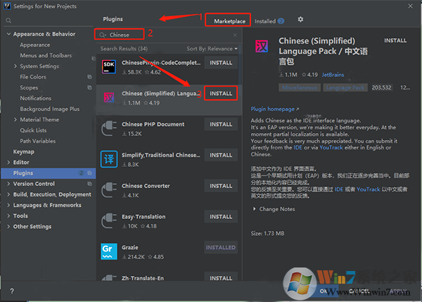 2、点击下“marketplace”接着在输入框中输入“Chinese”后即可找到汉化插件,点击“install”进行下载