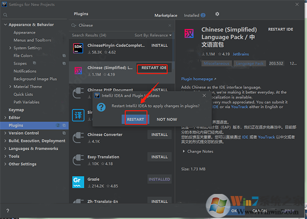 3、下载完成后点击“restart ide”——“restart”