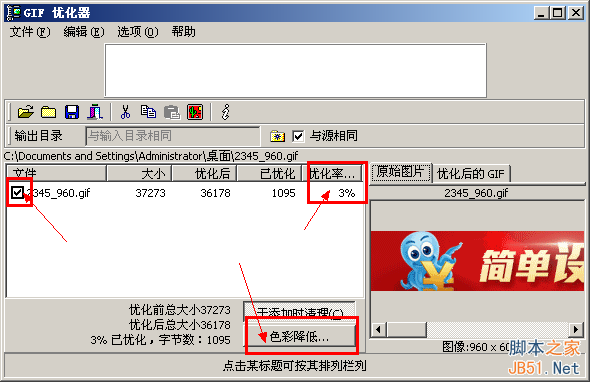 勾上要压缩的图片,其实这个时候已经提示压缩率什么的了,但是还是很大,我们可以通过 色彩降低来实现,一般情况下,网页图片也不用这么多色彩。