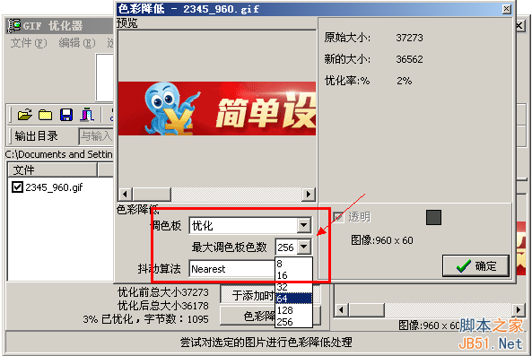 一般我们把最大调色板色数,改为 128 或 64就可以了,现在基本上能满足我们的要求了(30K左右)。