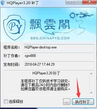 32位,打开补丁,先注入补丁,在文件夹选择界面,定位到hqplayer的安装文件夹并选中hqplayer主程序,确定,然后选择执行补丁,OK。