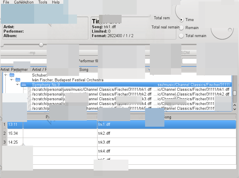 这是所谓的运输清单,也就是图书馆。您可以配置使用文件内容/图书馆……菜单项。你可以从这个列表中选择两种类型的条目。主要的一个是“运输”,强调在这里,这是一个完整的子目录(或光盘驱动器)。基于常用的交通通常等于一个专辑歌手/专辑歌曲的布局。另一个是单个文件——通常是一首歌。选择一首歌改变播放模式播放列表模式下,您可以添加更多的轨道通过选择更多的轨道或拖放从外部应用程序的*。直接DSDIFF / DSF回放时只能在运输模式或播放列表只包含DSDIFF和/或DSF文件,当播放列表还包含其他受支持的文件类型PCM转换使用。当前模式显示在状态栏区域,在每一个选择。