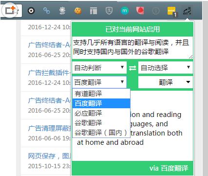 划词翻译支持谷歌、百度、有道、必应四大翻译和朗读引擎,可以方便的查看、复制和朗读不同引擎的翻译结果。是一个简便但强大的翻译扩展。