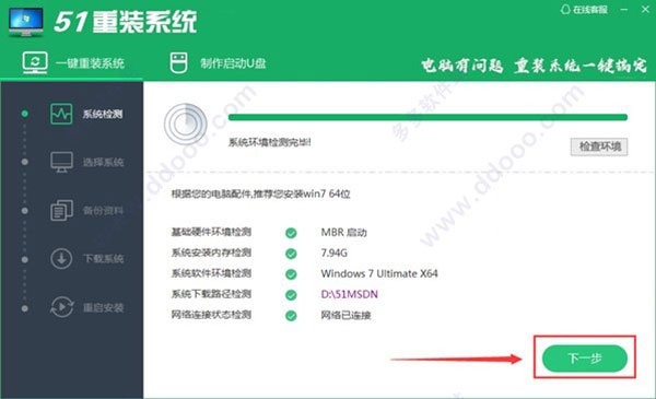 51一键重装系统是一款简单易用的在线系统重装工具,完美支持全自动一键在线装机,这款工具使用简单,打开运行后便会自动检测用户机配置给出最合适的提供推荐,也可以手动选择,支持原版系统安装,系统想换就换。安装步骤通常有:系统检测--选择系统--备份资料--下载系统--重启安装,简单明了,一看便会!