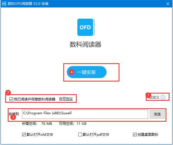 2、可点击自定义,阅读协议并勾选"我已阅读并同意...",可更改软件安装位置,点击一键安装