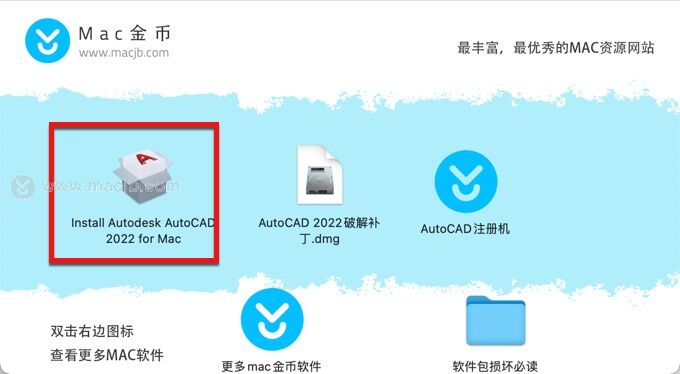 cad2022破解下载完后打开镜像包,首先双击【Install Autodesk AutoCAD 2022 for Mac】进行安装,如图