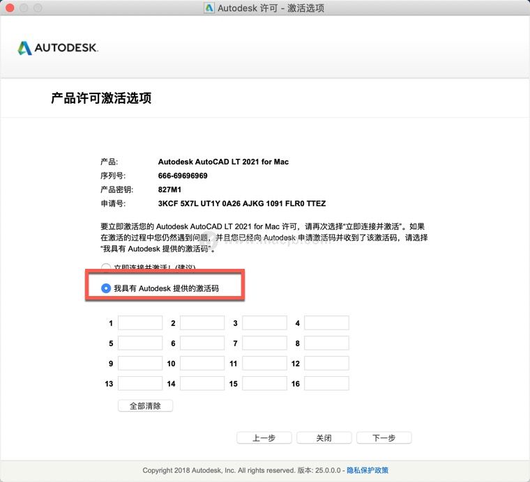 在产品许可激活选项页面选择“我具有Autodesk提供的激活码”