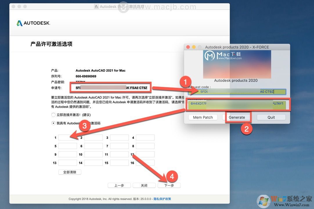 然后将"产品许可激活选项"中的申请号复制到"AutoCAD2022注册机"中的”Request code"下框中(这里复制“申请号”的时候比较特殊,我们分两个动作来讲,复制申请号是用键盘快捷键command+c复制,粘贴到注册机要用鼠标右键粘贴),点击”Generate”,即可生成AutoCAD序列号,在AutoCAD 2022许可激活选项页面,将生成的AutoCAD序列号(全选点击右键,点击"copy”)粘贴到”我具有Autodest提供的激活码”下方,