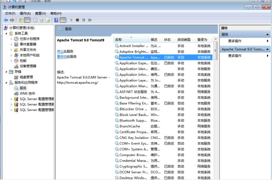 然后进入控制面板—系统和安全—管理工具—服务,找到Apache Tomcat Tomcat9服务项,右击该项,点“启动”,启动该服务,见下图所示: