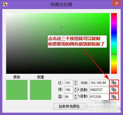有“RGB”、“十进制”、“十六进制”三种方式可选,点击这三种方式右边的复制按钮,即可将相应数值复制到剪贴板了