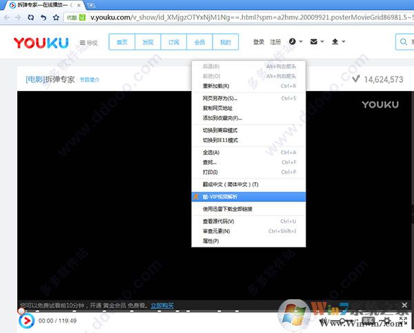 打开自己要开的电影,然后找一个 空白的位置! 点击鼠标右键就可以看到酷-VIP视频解析,然后点击就可以看VIP啦