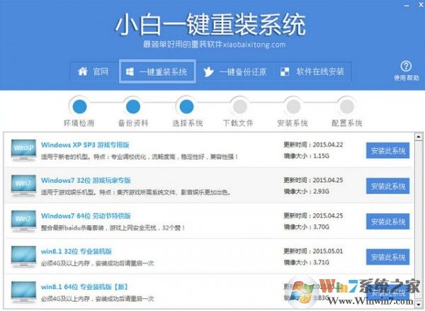 第四步、进入小白系统重装软件的系统下载列表界面,根据需求以及电脑配置情况选择适合你的系统版本,点击右边的“安装此系统”;