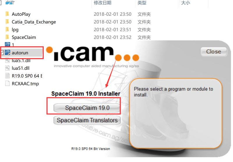 5.所有必备条件完成后,我们开始安装SpaceClaim2018,虚拟光驱加载Ansys.SpaceClaim.19.0.Win64.iso,然后打开Ansys.SpaceClaim.19.0.Win64虚拟盘,双击文件夹内的autorun.exe开始安装,点安装界面的SpaceClaim 19..0安装