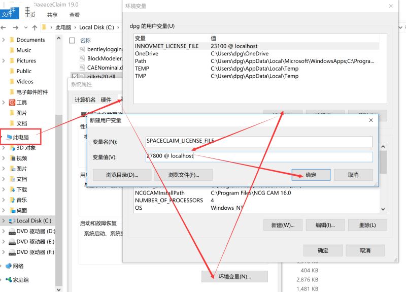 14.创建环境变量:SPACECLAIM_LICENSE_FILE = 27800 @ localhost 如图所示