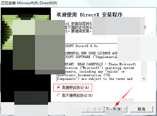10、接着会弹出DirextX安装向导,选择“我接受此协议”,点击“下一步”。