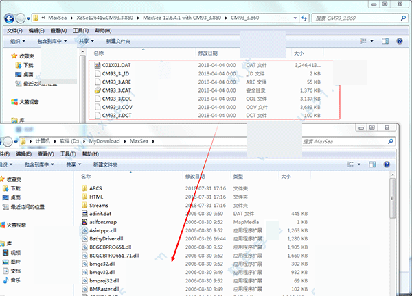 14、回到文件包,在“MaxSea\XaSe12641wCM93.3.860\MaxSea 12.6.4.1 with CM93_3.860\CM93_3.860”目录下,找到破解文件并复制到软件安装根目录下即可完成破解,默认为:C:\Program Files (x86)\MaxSea International\MaxSea\,见下图所示: