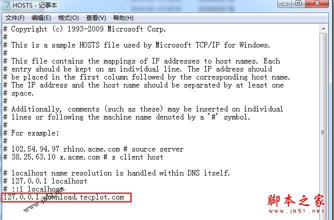9、打开C:\ Windows \ System32 \ drivers \ etc,以记事本方式打开hosts,将127.0.0.1 download.tecplot.com添加到hosts文件中,见下图