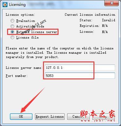 11、运行软件,当被问及许可证时,选择“网络许可证”并给出“许可证服务器名称”:l127.0.0.1(许可证服务器名称如果localhost不行就填写127.0.0.1)和“端口号”5053/26800,见下图