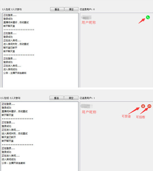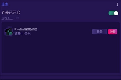 5、点击接通后,主播已接通粉丝的连线;当粉丝音质不好或暂时不需要发言时主播可点击静音按钮,此时该粉丝的发言将不会被播放,当连麦环节已结束时,主播可点击挂断按钮,结束与该粉丝的连麦