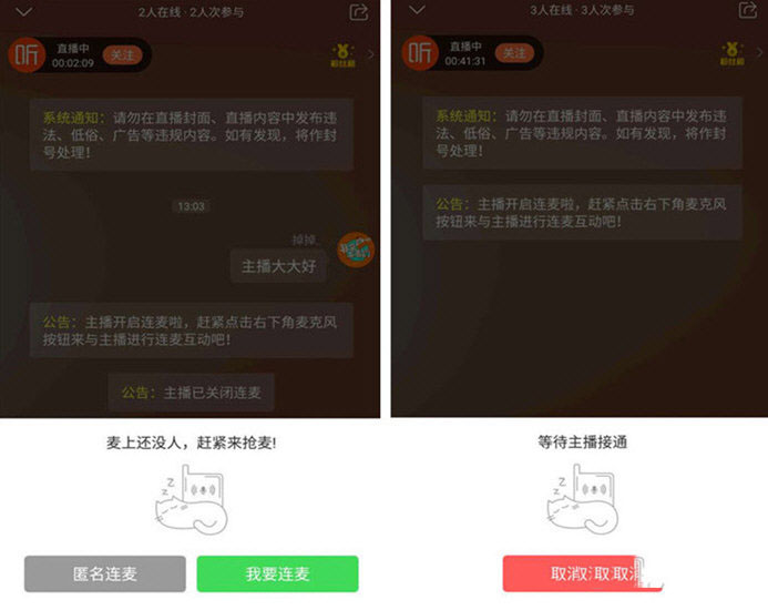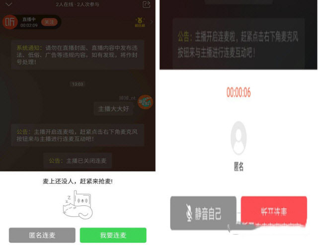 2、点击右下方绿色的连麦按钮后,会出现如下左图所示的情况,可以选择连麦或匿名连麦