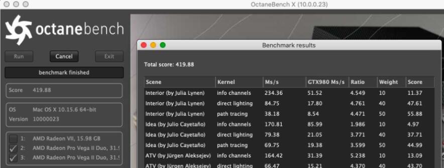 排行根据OTOY在AppleRadeonProVegaIIDuoMPX控制模块上记载的415OB的OctaneBench(V4)优秀率(相对性于最大优秀率,默认设置时钟速度,MacPro/macOS10.15.6,OctaneX|PR1)截止到2020年7月20日的401OB的功能在这里公布的OctaneBench单GPU标准测验中列举。